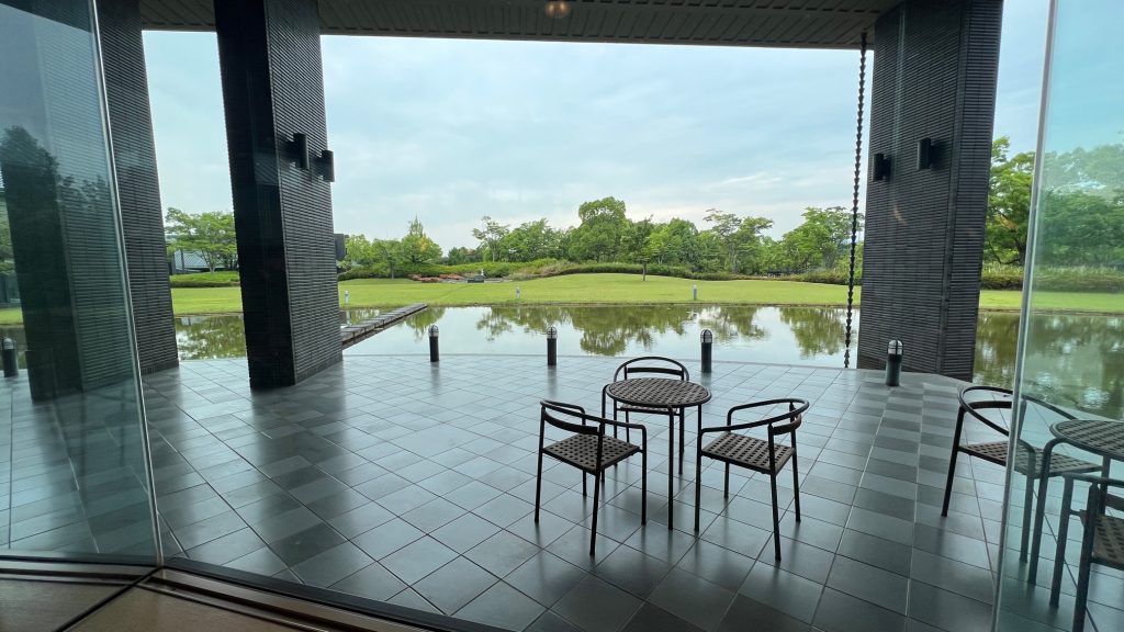 コミュニティホール前の池の先の庭は芝刈りロボットが毎日せっせと芝刈りしているのが見えます。